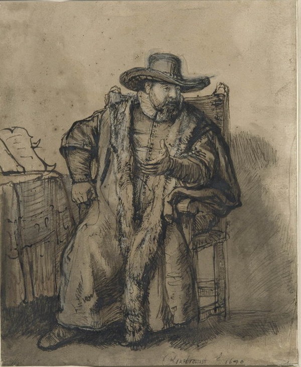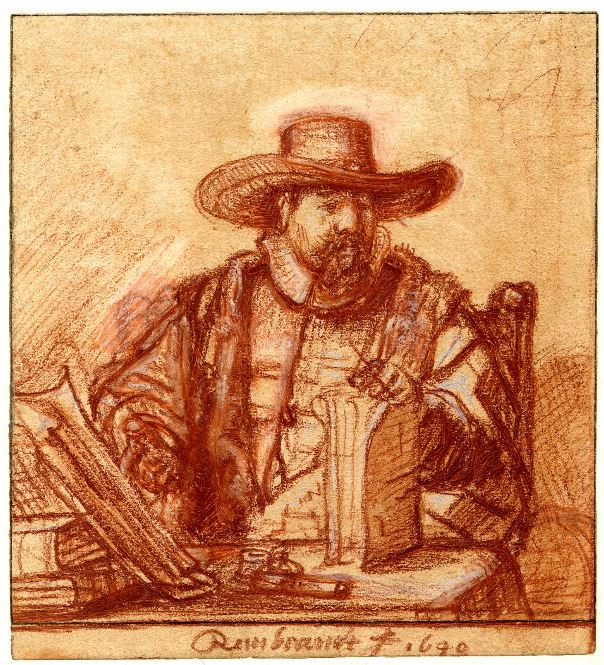 KAREL: he holds his pen in his left hand, because the drawing is done to prepare for an etching. If you copy the image on a copper or zinc plate and then print it, you get a mirror image, which means that in the printed etching, Anslo appears as having a pen in his right hand, since the mirror image inverses the directionality. You have to plan that from the start.