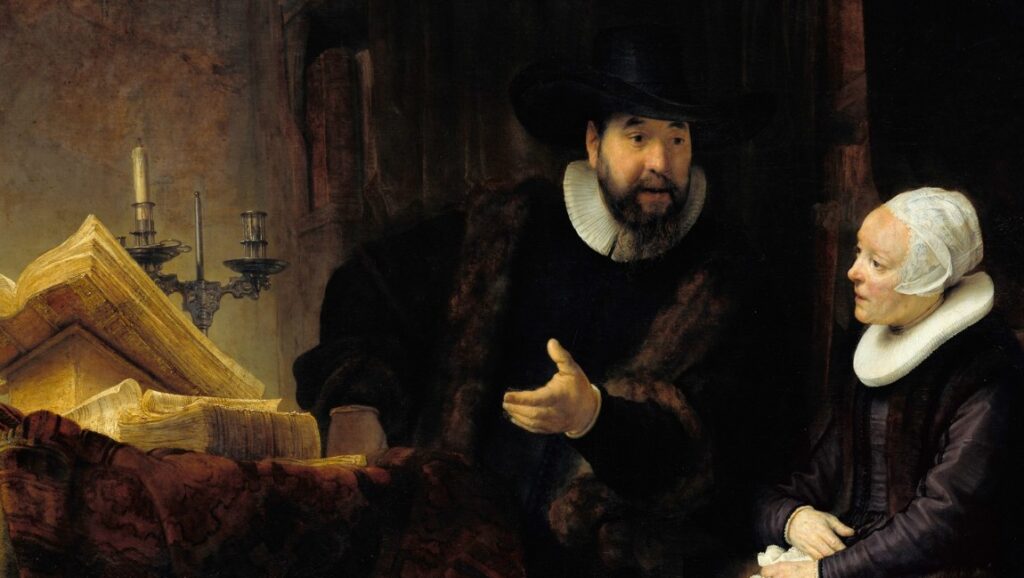 On the painting, we see the Mennonite preacher Cornelis Anslo sitting at a table with some large books on his right and seemingly uttering words of consolation to a woman, most probably his wife.1