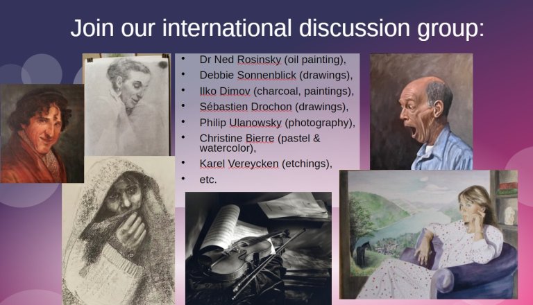 To conclude, if you want to continue this type of discussion, I invite all of you all join the international working group on art among practicing artists, initiated by Dr Ned Rosinsky. So far, it mainly includes Debbie Sonnenblick, Ilko Dimov, Dean Clark, eventually Sébastien Drochon, Agnès Farkas and Remi Lebrun, Philip Ulanowsky, Christine Bierre and myself. You see some works here (shows folder). Please get in touch with me for that.