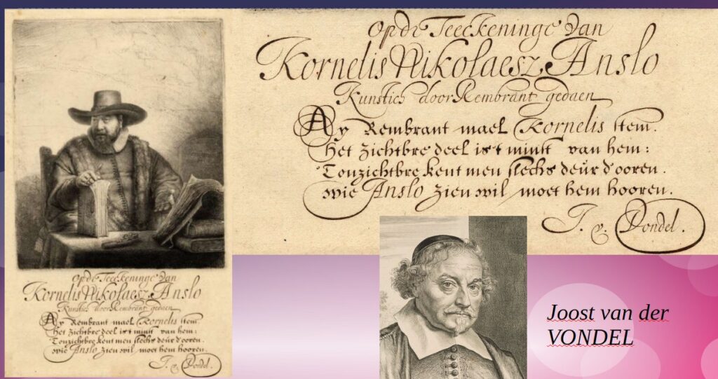 Strange? Not really. To come to an answer we need to go around it. What is hardly known, is that underneath the printed etching one finds a short poem of Joost van der Vondel, considered the greatest poet of the Dutch language: