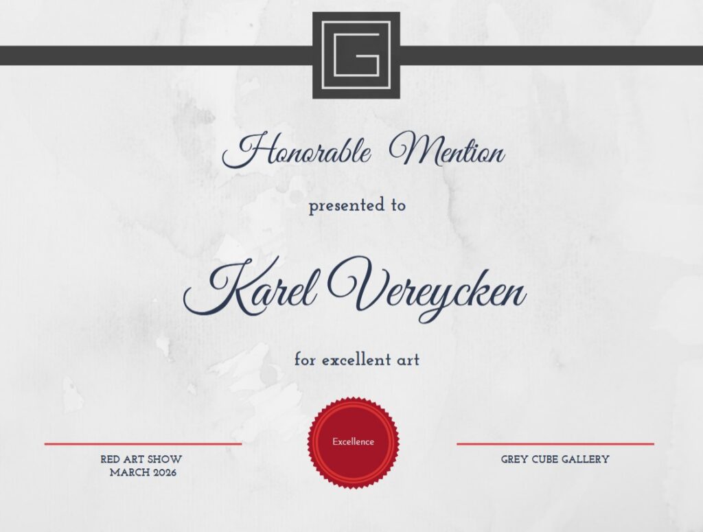 On March 7, 2026, The Grey Cube Gallery informed the Franco Belgian painter and engraver Karel Vereycken: « your artworks have been selected for inclusion into the 2026 Red online art show. Congratulations on winning the Honorable Mention award. »