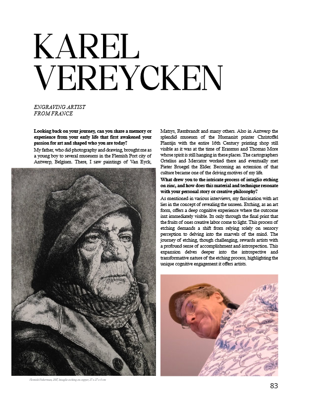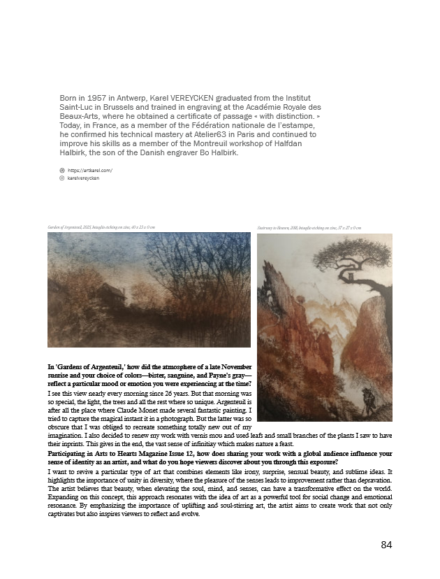 The international art magazine Art to Hearts, in its edition #12 appearing in April 2026, took two pages (p. 83-84) to feature the artistic statement and three engravings of Franco-Belgian painter engraver Karel Vereycken.