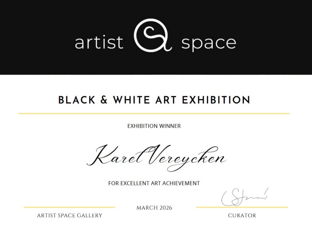 On March 8th, 2026, Franco-Belgian painter engraver Karel Vereycken was informed that he had been « accepted to exhibit » his « work in the « 4th Black & White online art exhibition » of the Artist Space Gallery. « Thank you for your participation and congratulations on your achievement. »