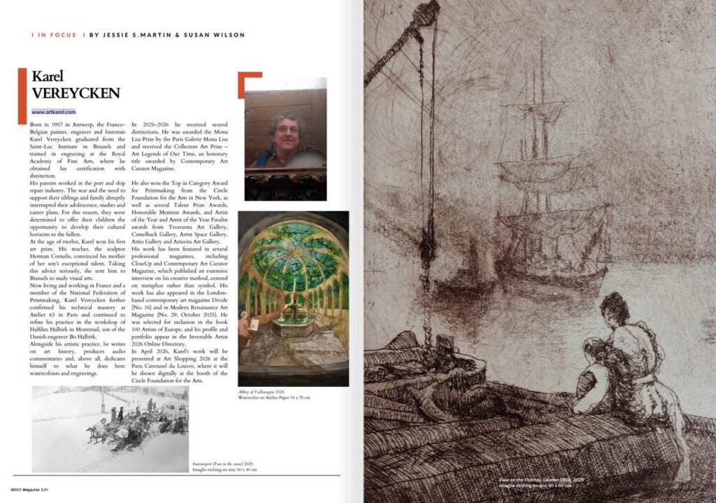 The outstanding and beautiful International Art Lovers Magazine (ARTLO), published in Spain, in its March-April issue N° 6, 2026, offers a two page feature article on Franco Belgian painter engraver and historian Karel Vereycken.