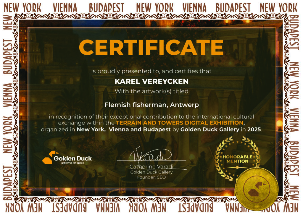 On January 21, Franco-Belgian painter engraver and historian Karel Vereycken was informed by Marta Faczan, the Gallery Assistant of the Golden Duck Gallery & Art space in Budapest, Hongary, that he was granted an « Honorable Mention Award » :