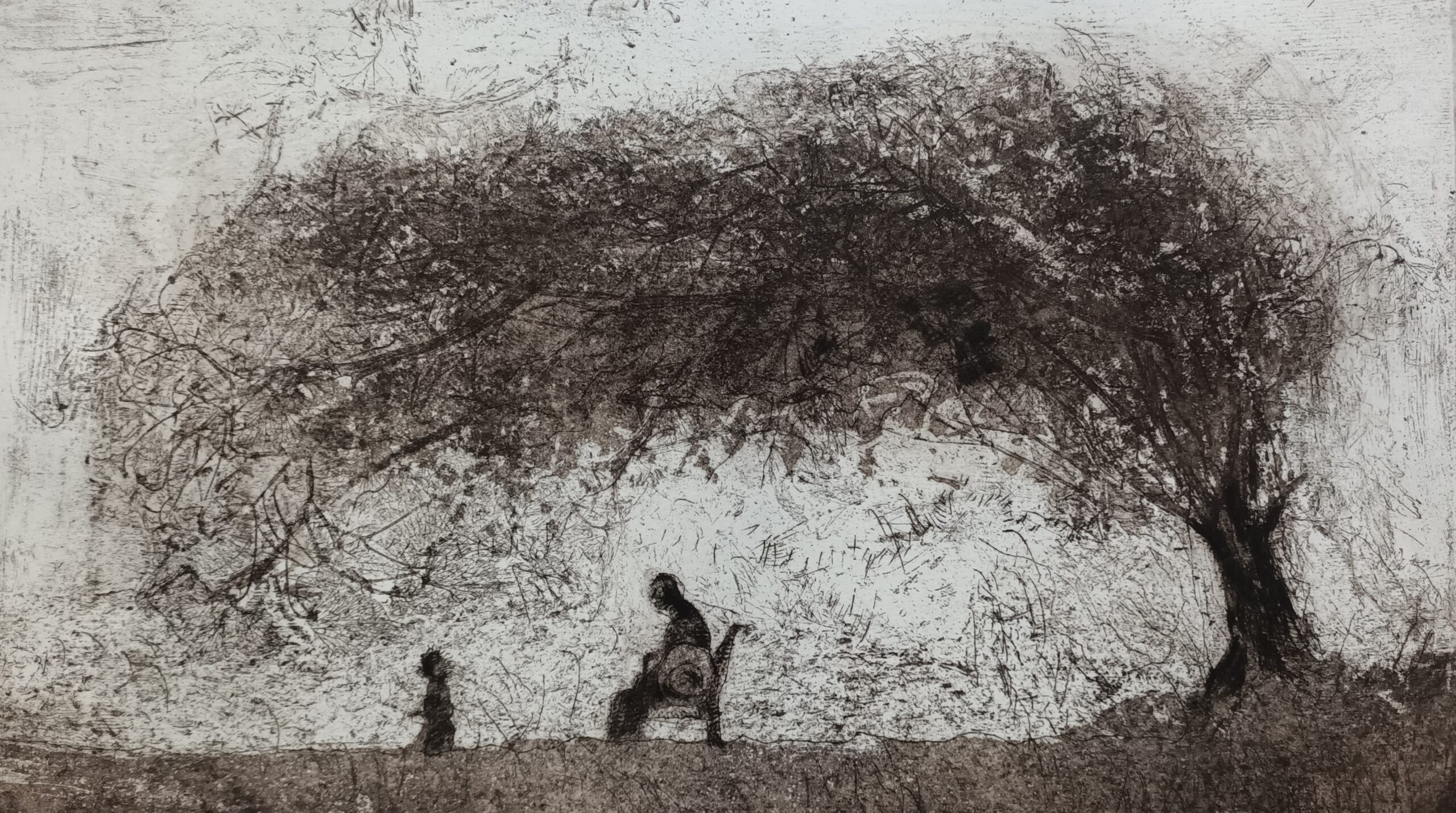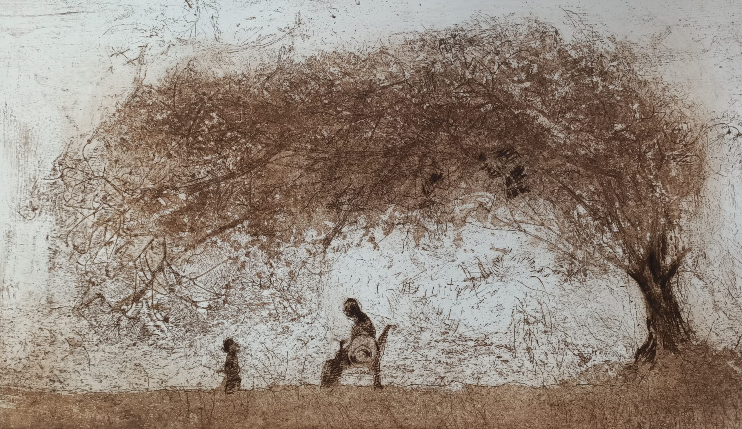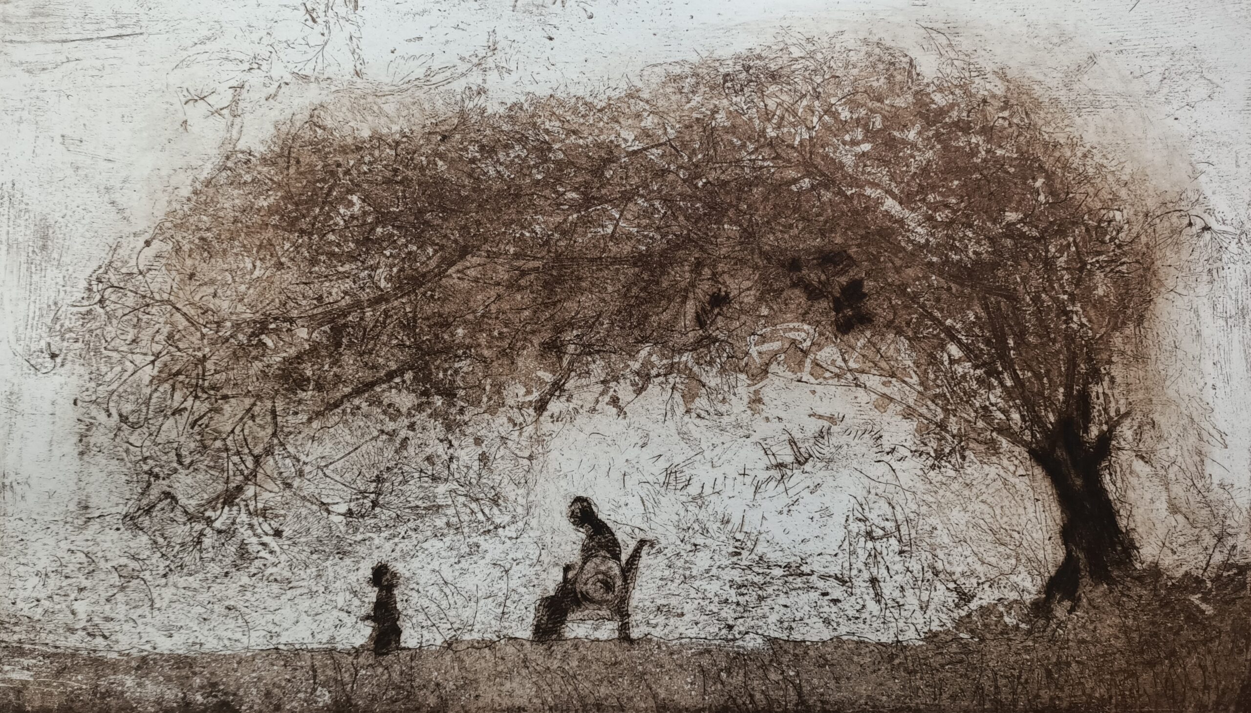 Karel Vereycken, L’Arbre de la vie, eau-forte sur zinc, vernis mou, terre de sienne, bistre, 4e état, 40 x 23 cm, 2026.
