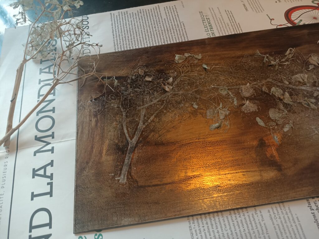 Préparation de vernis mou avant morsure avec branches sèchées de chrysanthèmes.