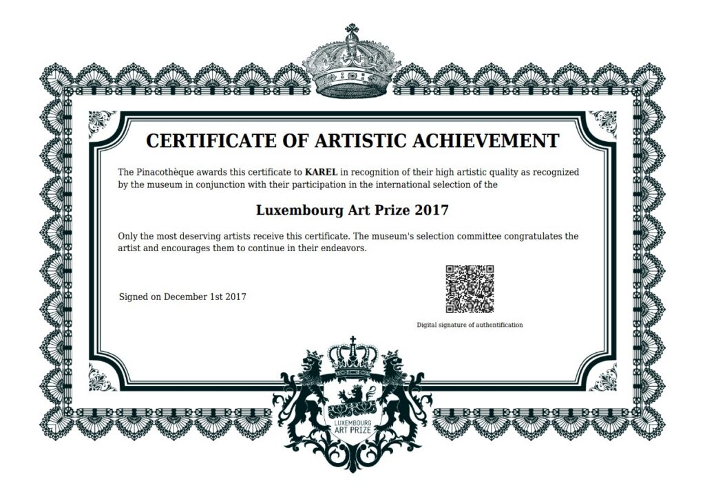 Posted in Honors, awards and prizes | Commentaires fermés sur Karel Vereycken awarded in Luxembourg Art Prize 2017 Tags: 2017, artistic quality, artkarel, Certificate of Artistic Achievement, Karel, Karel Vereycken, Luxembourg Art Prize, Pinacotèque, Vereycken